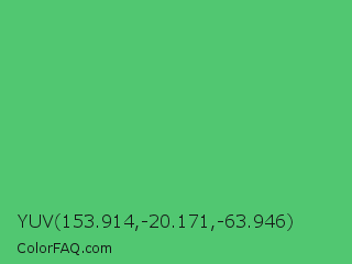 YUV 153.914,-20.171,-63.946 Color is a normal green color and the nearest color is Emerald #50c878. Hex code #51c771 and RGB value is rgb(81,199,113). In RGB color space, this color is composed of 32% red, 78% green, 44% blue, In CMYK color space, this color is composed of 59% cyan, 0% magenta, 43% yellow , 22% black , In HSL color space, this color has a hue angle of 136° , 51% saturation and 55% lightness.