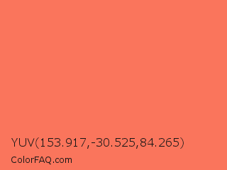 YUV 153.917,-30.525,84.265 Color is a light red color and the nearest color is Bittersweet #fe6f5e. Hex code #fa755c and RGB value is rgb(250,117,92). In RGB color space, this color is composed of 98% red, 46% green, 36% blue, In CMYK color space, this color is composed of 0% cyan, 53% magenta, 63% yellow , 2% black , In HSL color space, this color has a hue angle of 9° , 94% saturation and 67% lightness.