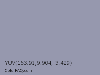 YUV 153.91,9.904,-3.429 Color is a light blue color and the nearest color is Manatee #979aaa. Hex code #9698ae and RGB value is rgb(150,152,174). In RGB color space, this color is composed of 59% red, 60% green, 68% blue, In CMYK color space, this color is composed of 14% cyan, 13% magenta, 0% yellow , 32% black , In HSL color space, this color has a hue angle of 235° , 13% saturation and 64% lightness.