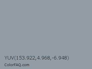 YUV 153.922,4.968,-6.948 Color is a light blue color and the nearest color is Manatee #979aaa. Hex code #929ca4 and RGB value is rgb(146,156,164). In RGB color space, this color is composed of 57% red, 61% green, 64% blue, In CMYK color space, this color is composed of 11% cyan, 5% magenta, 0% yellow , 36% black , In HSL color space, this color has a hue angle of 207° , 9% saturation and 61% lightness.