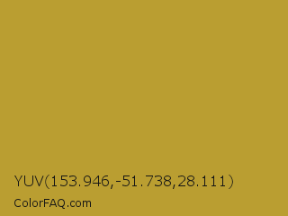 YUV 153.946,-51.738,28.111 Color is a normal yellow color and the nearest color is Satin Sheen Gold #cba135. Hex code #ba9e31 and RGB value is rgb(186,158,49). In RGB color space, this color is composed of 73% red, 62% green, 19% blue, In CMYK color space, this color is composed of 0% cyan, 15% magenta, 74% yellow , 27% black , In HSL color space, this color has a hue angle of 48° , 58% saturation and 46% lightness.