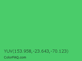 YUV 153.958,-23.643,-70.123 Color is a normal green color and the nearest color is UFO Green #3cd070. Hex code #4acc6a and RGB value is rgb(74,204,106). In RGB color space, this color is composed of 29% red, 80% green, 42% blue, In CMYK color space, this color is composed of 64% cyan, 0% magenta, 48% yellow , 20% black , In HSL color space, this color has a hue angle of 135° , 56% saturation and 55% lightness.