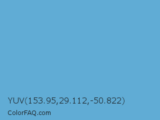 YUV 153.95,29.112,-50.822 Color is a light blue color and the nearest color is Carolina Blue #56a0d3. Hex code #60acd5 and RGB value is rgb(96,172,213). In RGB color space, this color is composed of 38% red, 67% green, 84% blue, In CMYK color space, this color is composed of 55% cyan, 19% magenta, 0% yellow , 16% black , In HSL color space, this color has a hue angle of 201° , 58% saturation and 61% lightness.