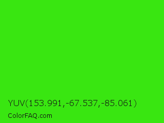 YUV 153.991,-67.537,-85.061 Color is a normal green color and the nearest color is Neon Green #39ff14. Hex code #39e611 and RGB value is rgb(57,230,17). In RGB color space, this color is composed of 22% red, 90% green, 7% blue, In CMYK color space, this color is composed of 75% cyan, 0% magenta, 93% yellow , 10% black , In HSL color space, this color has a hue angle of 109° , 86% saturation and 48% lightness.