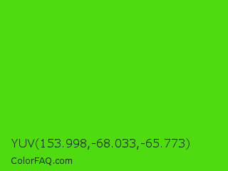 YUV 153.998,-68.033,-65.773 Color is a normal green color and the nearest color is Harlequin Green #46cb18. Hex code #4fdb10 and RGB value is rgb(79,219,16). In RGB color space, this color is composed of 31% red, 86% green, 6% blue, In CMYK color space, this color is composed of 64% cyan, 0% magenta, 93% yellow , 14% black , In HSL color space, this color has a hue angle of 101° , 86% saturation and 46% lightness.