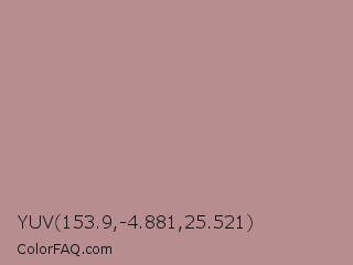 YUV 153.9,-4.881,25.521 Color is a light red color and the nearest color is Rosy Brown #bc8f8f. Hex code #b78d90 and RGB value is rgb(183,141,144). In RGB color space, this color is composed of 72% red, 55% green, 56% blue, In CMYK color space, this color is composed of 0% cyan, 23% magenta, 21% yellow , 28% black , In HSL color space, this color has a hue angle of 356° , 23% saturation and 64% lightness.