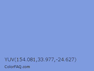 YUV 154.081,33.977,-24.627 Color is a light blue color and the nearest color is Vista Blue #7c9ed9. Hex code #7e9bdf and RGB value is rgb(126,155,223). In RGB color space, this color is composed of 49% red, 61% green, 87% blue, In CMYK color space, this color is composed of 43% cyan, 30% magenta, 0% yellow , 13% black , In HSL color space, this color has a hue angle of 222° , 60% saturation and 68% lightness.