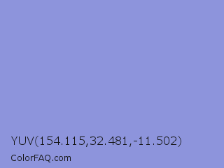 YUV 154.115,32.481,-11.502 Color is a light blue color and the nearest color is Ceil #92a1cf. Hex code #8d94dc and RGB value is rgb(141,148,220). In RGB color space, this color is composed of 55% red, 58% green, 86% blue, In CMYK color space, this color is composed of 36% cyan, 33% magenta, 0% yellow , 14% black , In HSL color space, this color has a hue angle of 235° , 53% saturation and 71% lightness.