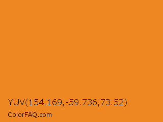 YUV 154.169,-59.736,73.52 Color is a normal orange color and the nearest color is Carrot Orange #ed9121. Hex code #ee8721 and RGB value is rgb(238,135,33). In RGB color space, this color is composed of 93% red, 53% green, 13% blue, In CMYK color space, this color is composed of 0% cyan, 43% magenta, 86% yellow , 7% black , In HSL color space, this color has a hue angle of 30° , 86% saturation and 53% lightness.