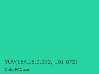 YUV 154.16,3.372,-101.872 Color is a normal green color and the nearest color is Shamrock #33cc99. Hex code #26d4a1 and RGB value is rgb(38,212,161). In RGB color space, this color is composed of 15% red, 83% green, 63% blue, In CMYK color space, this color is composed of 82% cyan, 0% magenta, 24% yellow , 17% black , In HSL color space, this color has a hue angle of 162° , 70% saturation and 49% lightness.