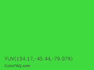 YUV 154.17,-45.44,-79.079 Color is a normal green color and the nearest color is Lime Green #32cd32. Hex code #40da3e and RGB value is rgb(64,218,62). In RGB color space, this color is composed of 25% red, 85% green, 24% blue, In CMYK color space, this color is composed of 71% cyan, 0% magenta, 72% yellow , 15% black , In HSL color space, this color has a hue angle of 119° , 68% saturation and 55% lightness.