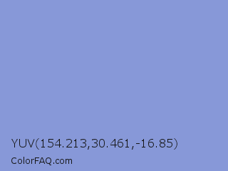 YUV 154.213,30.461,-16.85 Color is a light blue color and the nearest color is Vista Blue #7c9ed9. Hex code #8798d8 and RGB value is rgb(135,152,216). In RGB color space, this color is composed of 53% red, 60% green, 85% blue, In CMYK color space, this color is composed of 38% cyan, 30% magenta, 0% yellow , 15% black , In HSL color space, this color has a hue angle of 227° , 51% saturation and 69% lightness.