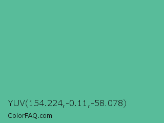YUV 154.224,-0.11,-58.078 Color is a normal green color and the nearest color is Ocean Green #48bf91. Hex code #58bc9a and RGB value is rgb(88,188,154). In RGB color space, this color is composed of 35% red, 74% green, 60% blue, In CMYK color space, this color is composed of 53% cyan, 0% magenta, 18% yellow , 26% black , In HSL color space, this color has a hue angle of 160° , 43% saturation and 54% lightness.
