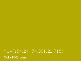 YUV 154.24,-74.561,21.715 Color is a normal yellow color and the nearest color is Buddha Gold #c1a004. Hex code #b3ab03 and RGB value is rgb(179,171,3). In RGB color space, this color is composed of 70% red, 67% green, 1% blue, In CMYK color space, this color is composed of 0% cyan, 4% magenta, 98% yellow , 30% black , In HSL color space, this color has a hue angle of 57° , 97% saturation and 36% lightness.