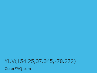 YUV 154.25,37.345,-78.272 Color is a normal blue color and the nearest color is Picton Blue #45b1e8. Hex code #41b9e6 and RGB value is rgb(65,185,230). In RGB color space, this color is composed of 25% red, 73% green, 90% blue, In CMYK color space, this color is composed of 72% cyan, 20% magenta, 0% yellow , 10% black , In HSL color space, this color has a hue angle of 196° , 77% saturation and 58% lightness.