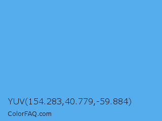 YUV 154.283,40.779,-59.884 Color is a light blue color and the nearest color is Blue Jeans #5dadec. Hex code #56aded and RGB value is rgb(86,173,237). In RGB color space, this color is composed of 34% red, 68% green, 93% blue, In CMYK color space, this color is composed of 64% cyan, 27% magenta, 0% yellow , 7% black , In HSL color space, this color has a hue angle of 205° , 81% saturation and 63% lightness.