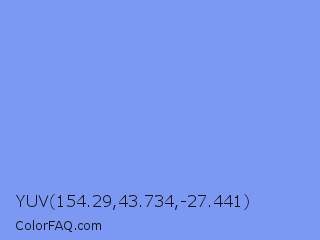 YUV 154.29,43.734,-27.441 Color is a light blue color and the nearest color is Portage #8b9fee. Hex code #7b99f3 and RGB value is rgb(123,153,243). In RGB color space, this color is composed of 48% red, 60% green, 95% blue, In CMYK color space, this color is composed of 49% cyan, 37% magenta, 0% yellow , 5% black , In HSL color space, this color has a hue angle of 225° , 83% saturation and 72% lightness.