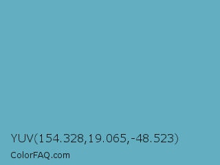 YUV 154.328,19.065,-48.523 Color is a normal cyan color and the nearest color is Fountain Blue #56b4be. Hex code #63afc1 and RGB value is rgb(99,175,193). In RGB color space, this color is composed of 39% red, 69% green, 76% blue, In CMYK color space, this color is composed of 49% cyan, 9% magenta, 0% yellow , 24% black , In HSL color space, this color has a hue angle of 191° , 43% saturation and 57% lightness.