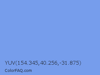 YUV 154.345,40.256,-31.875 Color is a light blue color and the nearest color is Little Boy Blue #6ca0dc. Hex code #769dec and RGB value is rgb(118,157,236). In RGB color space, this color is composed of 46% red, 62% green, 93% blue, In CMYK color space, this color is composed of 50% cyan, 33% magenta, 0% yellow , 7% black , In HSL color space, this color has a hue angle of 220° , 76% saturation and 69% lightness.