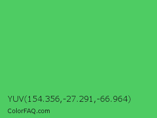 YUV 154.356,-27.291,-66.964 Color is a normal green color and the nearest color is Emerald #50c878. Hex code #4ecc63 and RGB value is rgb(78,204,99). In RGB color space, this color is composed of 31% red, 80% green, 39% blue, In CMYK color space, this color is composed of 62% cyan, 0% magenta, 51% yellow , 20% black , In HSL color space, this color has a hue angle of 130° , 55% saturation and 55% lightness.