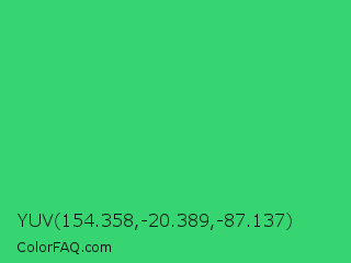 YUV 154.358,-20.389,-87.137 Color is a normal green color and the nearest color is UFO Green #3cd070. Hex code #37d571 and RGB value is rgb(55,213,113). In RGB color space, this color is composed of 22% red, 84% green, 44% blue, In CMYK color space, this color is composed of 74% cyan, 0% magenta, 47% yellow , 16% black , In HSL color space, this color has a hue angle of 142° , 65% saturation and 53% lightness.