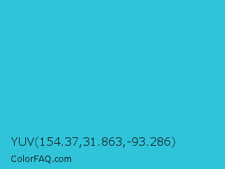 YUV 154.37,31.863,-93.286 Color is a normal cyan color and the nearest color is Scooter #2ebfd4. Hex code #30c4db and RGB value is rgb(48,196,219). In RGB color space, this color is composed of 19% red, 77% green, 86% blue, In CMYK color space, this color is composed of 78% cyan, 11% magenta, 0% yellow , 14% black , In HSL color space, this color has a hue angle of 188° , 70% saturation and 52% lightness.