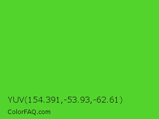 YUV 154.391,-53.93,-62.61 Color is a normal green color and the nearest color is Harlequin Green #46cb18. Hex code #53d42d and RGB value is rgb(83,212,45). In RGB color space, this color is composed of 33% red, 83% green, 18% blue, In CMYK color space, this color is composed of 61% cyan, 0% magenta, 79% yellow , 17% black , In HSL color space, this color has a hue angle of 106° , 66% saturation and 50% lightness.