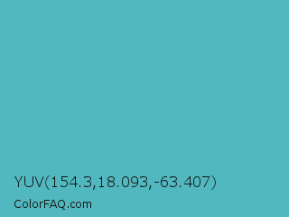 YUV 154.3,18.093,-63.407 Color is a normal cyan color and the nearest color is Fountain Blue #56b4be. Hex code #52b8bf and RGB value is rgb(82,184,191). In RGB color space, this color is composed of 32% red, 72% green, 75% blue, In CMYK color space, this color is composed of 57% cyan, 4% magenta, 0% yellow , 25% black , In HSL color space, this color has a hue angle of 184° , 46% saturation and 54% lightness.