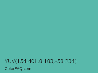 YUV 154.401,8.183,-58.234 Color is a normal cyan color and the nearest color is Tradewind #5fb3ac. Hex code #58b9ab and RGB value is rgb(88,185,171). In RGB color space, this color is composed of 35% red, 73% green, 67% blue, In CMYK color space, this color is composed of 52% cyan, 0% magenta, 8% yellow , 27% black , In HSL color space, this color has a hue angle of 171° , 41% saturation and 54% lightness.