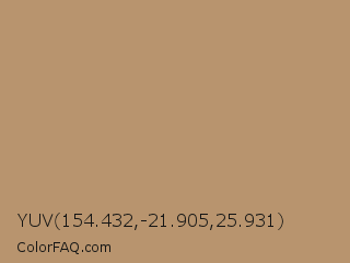 YUV 154.432,-21.905,25.931 Color is a normal orange color and the nearest color is Light Taupe #b38b6d. Hex code #b8946e and RGB value is rgb(184,148,110). In RGB color space, this color is composed of 72% red, 58% green, 43% blue, In CMYK color space, this color is composed of 0% cyan, 20% magenta, 40% yellow , 28% black , In HSL color space, this color has a hue angle of 31° , 34% saturation and 58% lightness.