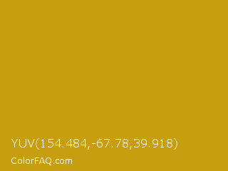 YUV 154.484,-67.78,39.918 Color is a normal yellow color and the nearest color is Pizza #c99415. Hex code #c89e11 and RGB value is rgb(200,158,17). In RGB color space, this color is composed of 78% red, 62% green, 7% blue, In CMYK color space, this color is composed of 0% cyan, 21% magenta, 92% yellow , 22% black , In HSL color space, this color has a hue angle of 46° , 84% saturation and 43% lightness.