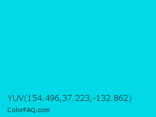 YUV 154.496,37.223,-132.862 Color is a normal cyan color and the nearest color is Bright Turquoise #08e8de. Hex code #03d9e6 and RGB value is rgb(3,217,230). In RGB color space, this color is composed of 1% red, 85% green, 90% blue, In CMYK color space, this color is composed of 99% cyan, 6% magenta, 0% yellow , 10% black , In HSL color space, this color has a hue angle of 183° , 97% saturation and 46% lightness.