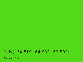 YUV 154.519,-64.839,-63.599 Color is a normal green color and the nearest color is Harlequin Green #46cb18. Hex code #52d917 and RGB value is rgb(82,217,23). In RGB color space, this color is composed of 32% red, 85% green, 9% blue, In CMYK color space, this color is composed of 62% cyan, 0% magenta, 89% yellow , 15% black , In HSL color space, this color has a hue angle of 102° , 81% saturation and 47% lightness.