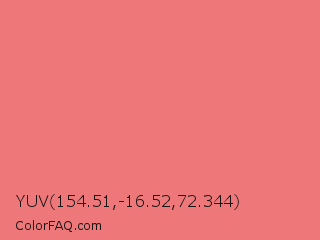 YUV 154.51,-16.52,72.344 Color is a light red color and the nearest color is Candy Pink #e4717a. Hex code #ed7779 and RGB value is rgb(237,119,121). In RGB color space, this color is composed of 93% red, 47% green, 47% blue, In CMYK color space, this color is composed of 0% cyan, 50% magenta, 49% yellow , 7% black , In HSL color space, this color has a hue angle of 359° , 77% saturation and 70% lightness.