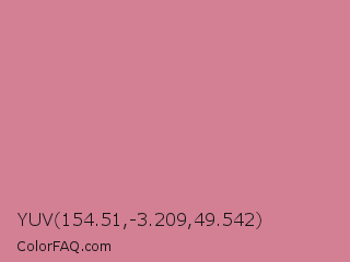 YUV 154.51,-3.209,49.542 Color is a light red color and the nearest color is Shimmering Blush #d98695. Hex code #d37f94 and RGB value is rgb(211,127,148). In RGB color space, this color is composed of 83% red, 50% green, 58% blue, In CMYK color space, this color is composed of 0% cyan, 40% magenta, 30% yellow , 17% black , In HSL color space, this color has a hue angle of 345° , 49% saturation and 66% lightness.