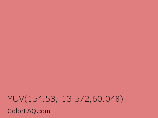 YUV 154.53,-13.572,60.048 Color is a light red color and the nearest color is New York Pink #d7837f. Hex code #df7d7f and RGB value is rgb(223,125,127). In RGB color space, this color is composed of 87% red, 49% green, 50% blue, In CMYK color space, this color is composed of 0% cyan, 44% magenta, 43% yellow , 13% black , In HSL color space, this color has a hue angle of 359° , 60% saturation and 68% lightness.