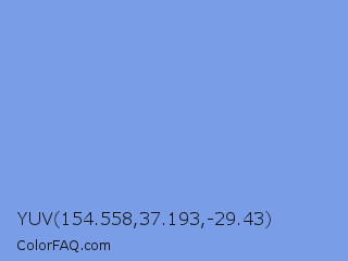 YUV 154.558,37.193,-29.43 Color is a light blue color and the nearest color is Vista Blue #7c9ed9. Hex code #799de6 and RGB value is rgb(121,157,230). In RGB color space, this color is composed of 47% red, 62% green, 90% blue, In CMYK color space, this color is composed of 47% cyan, 32% magenta, 0% yellow , 10% black , In HSL color space, this color has a hue angle of 220° , 69% saturation and 69% lightness.