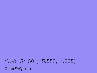 YUV 154.601,45.553,-4.035 Color is a light indigo color and the nearest color is Portage #8b9fee. Hex code #968bf7 and RGB value is rgb(150,139,247). In RGB color space, this color is composed of 59% red, 55% green, 97% blue, In CMYK color space, this color is composed of 39% cyan, 44% magenta, 0% yellow , 3% black , In HSL color space, this color has a hue angle of 246° , 87% saturation and 76% lightness.