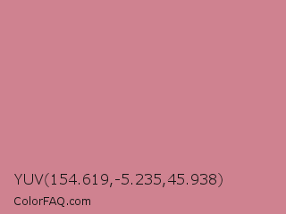 YUV 154.619,-5.235,45.938 Color is a light red color and the nearest color is Puce #cc8899. Hex code #cf8290 and RGB value is rgb(207,130,144). In RGB color space, this color is composed of 81% red, 51% green, 56% blue, In CMYK color space, this color is composed of 0% cyan, 37% magenta, 30% yellow , 19% black , In HSL color space, this color has a hue angle of 349° , 45% saturation and 66% lightness.