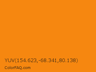 YUV 154.623,-68.341,80.138 Color is a normal orange color and the nearest color is West Side #ff910f. Hex code #f68710 and RGB value is rgb(246,135,16). In RGB color space, this color is composed of 96% red, 53% green, 6% blue, In CMYK color space, this color is composed of 0% cyan, 45% magenta, 93% yellow , 4% black , In HSL color space, this color has a hue angle of 31° , 93% saturation and 51% lightness.
