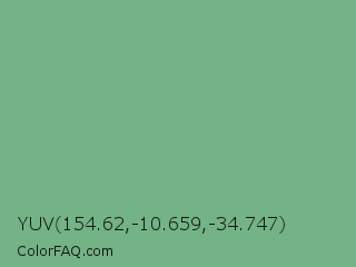 YUV 154.62,-10.659,-34.747 Color is a normal green color and the nearest color is Iguana Green #71bc78. Hex code #73b385 and RGB value is rgb(115,179,133). In RGB color space, this color is composed of 45% red, 70% green, 52% blue, In CMYK color space, this color is composed of 36% cyan, 0% magenta, 26% yellow , 30% black , In HSL color space, this color has a hue angle of 137° , 30% saturation and 58% lightness.
