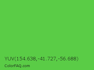 YUV 154.638,-41.727,-56.688 Color is a normal green color and the nearest color is Green RYB #66b032. Hex code #5acc46 and RGB value is rgb(90,204,70). In RGB color space, this color is composed of 35% red, 80% green, 27% blue, In CMYK color space, this color is composed of 56% cyan, 0% magenta, 66% yellow , 20% black , In HSL color space, this color has a hue angle of 111° , 57% saturation and 54% lightness.
