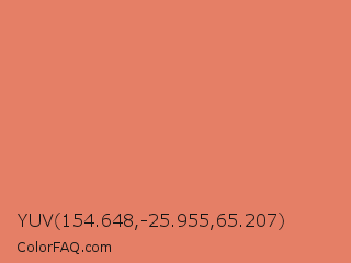 YUV 154.648,-25.955,65.207 Color is a light red color and the nearest color is Japonica #d87c63. Hex code #e57f66 and RGB value is rgb(229,127,102). In RGB color space, this color is composed of 90% red, 50% green, 40% blue, In CMYK color space, this color is composed of 0% cyan, 45% magenta, 55% yellow , 10% black , In HSL color space, this color has a hue angle of 12° , 71% saturation and 65% lightness.