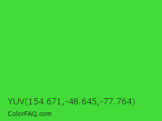 YUV 154.671,-48.645,-77.764 Color is a normal green color and the nearest color is Lime Green #32cd32. Hex code #42db38 and RGB value is rgb(66,219,56). In RGB color space, this color is composed of 26% red, 86% green, 22% blue, In CMYK color space, this color is composed of 70% cyan, 0% magenta, 74% yellow , 14% black , In HSL color space, this color has a hue angle of 116° , 69% saturation and 54% lightness.