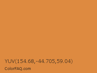 YUV 154.68,-44.705,59.04 Color is a normal orange color and the nearest color is Tigers Eye #e08d3c. Hex code #de8a40 and RGB value is rgb(222,138,64). In RGB color space, this color is composed of 87% red, 54% green, 25% blue, In CMYK color space, this color is composed of 0% cyan, 38% magenta, 71% yellow , 13% black , In HSL color space, this color has a hue angle of 28° , 71% saturation and 56% lightness.