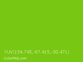 YUV 154.745,-67.415,-30.471 Color is a normal green color and the nearest color is Lima #76bd17. Hex code #78c712 and RGB value is rgb(120,199,18). In RGB color space, this color is composed of 47% red, 78% green, 7% blue, In CMYK color space, this color is composed of 40% cyan, 0% magenta, 91% yellow , 22% black , In HSL color space, this color has a hue angle of 86° , 83% saturation and 43% lightness.