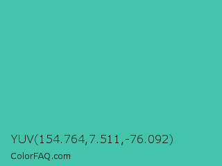 YUV 154.764,7.511,-76.092 Color is a normal cyan color and the nearest color is Puerto Rico #3fc1aa. Hex code #44c4aa and RGB value is rgb(68,196,170). In RGB color space, this color is composed of 27% red, 77% green, 67% blue, In CMYK color space, this color is composed of 65% cyan, 0% magenta, 13% yellow , 23% black , In HSL color space, this color has a hue angle of 168° , 52% saturation and 52% lightness.