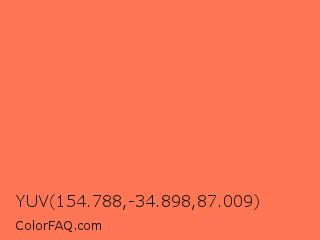 YUV 154.788,-34.898,87.009 Color is a light red color and the nearest color is Coral #ff7f50. Hex code #fe7654 and RGB value is rgb(254,118,84). In RGB color space, this color is composed of 100% red, 46% green, 33% blue, In CMYK color space, this color is composed of 0% cyan, 54% magenta, 67% yellow , 0% black , In HSL color space, this color has a hue angle of 12° , 99% saturation and 66% lightness.