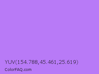YUV 154.788,45.461,25.619 Color is a light violet color and the nearest color is Lavender #b57edc. Hex code #b87af7 and RGB value is rgb(184,122,247). In RGB color space, this color is composed of 72% red, 48% green, 97% blue, In CMYK color space, this color is composed of 26% cyan, 51% magenta, 0% yellow , 3% black , In HSL color space, this color has a hue angle of 270° , 89% saturation and 72% lightness.
