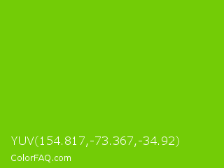 YUV 154.817,-73.367,-34.92 Color is a normal green color and the nearest color is Lima #76bd17. Hex code #73cc06 and RGB value is rgb(115,204,6). In RGB color space, this color is composed of 45% red, 80% green, 2% blue, In CMYK color space, this color is composed of 44% cyan, 0% magenta, 97% yellow , 20% black , In HSL color space, this color has a hue angle of 87° , 94% saturation and 41% lightness.